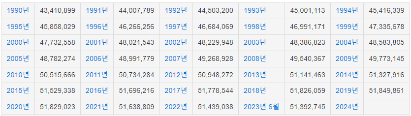 대한민국 인구는 1990년에 4341만명에서 2010년 처음으로 5천만명을 돌파했습니다. 2023년 현재 5139만명으로 인구는 꾸준히 증가했지만 인구 증가세가 감소하고 있습니다. 대한민국의 출산률이 지속적으로 하락하고 있어서 앞으로도 인구 증가폭이 크게 줄거나 인구가 감소할 수 있을 것으로 예상됩니다.