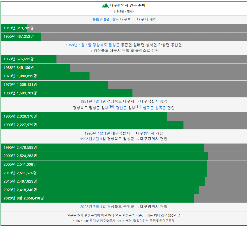 대구시 인구는 1949년 31만명 이었습니다. 그 이후 꾸준히 증가하여 1970년 100만명을 돌파했고, 2000년 가장 많은 인구인 252만명이 거주했습니다. 2023년 현재 235만명이 거주하고 있습니다.