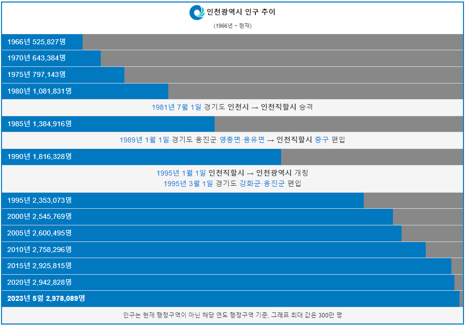 인천시 인구는 1966년 52만명 이었습니다. 그리고 1980년 처음으로 100만명을 돌파했고 그 이후로 수도권에 인구가 집중되면서 꾸준히 인구가 증가하였습니다. 2023년 현재 297만명이 인천시에 거주하고 있습니다.