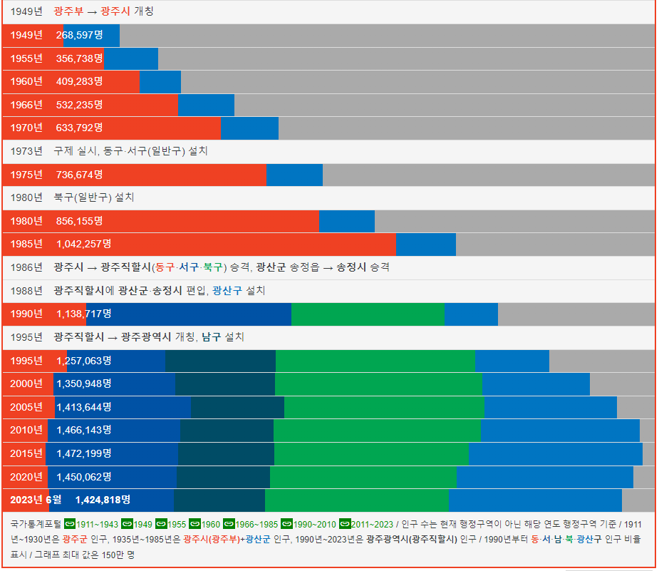광주시 인구는 1949년 26만명 이었습니다. 그리고 1985년 처음으로 100만명을 돌파했고 2015년 가장 많은 인구인 147만이 거주하였습니다. 2023년 현재 142만명이 광주시에 거주하고 있습니다.
