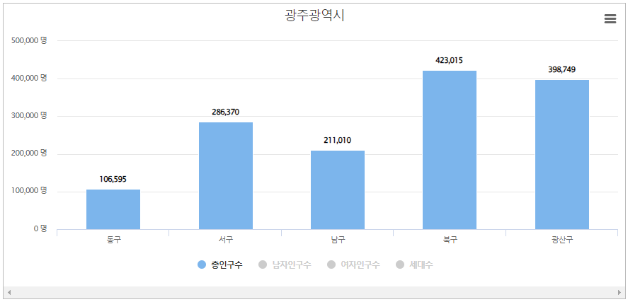 광주시에서 북구 인구가 가장 많으며 인구는 423,015명, 세대수는 198,757입니다. 두번째로는 광산구 인구가 많고 인구 398,749명, 세대수는 171,371입니다. 세번째는 서구로 인구는 286,370, 세대수는 134,116입니다.