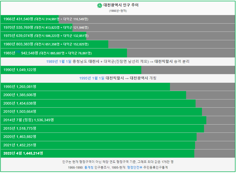 대전시 인구는 1966년 43만명 이었습니다. 그리고 1990년 처음으로 100만명을 돌파했고 2014년 가장 많은 인구인 153만이 거주하였습니다. 2023년 현재 144만명이 대전시에 거주하고 있습니다.