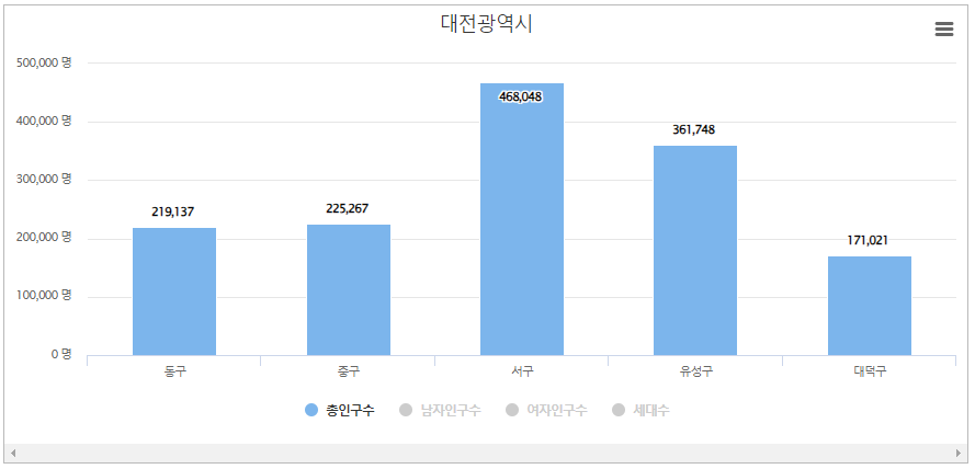 대전시에서 서구 인구가 가장 많으며 인구는 468,048명, 세대수는 217,627입니다. 두번째로는 유성구 인구가 많고 인구 361,748명, 세대수는 164,099입니다. 세번째는 중구로 인구는 225,267, 세대수는 107,476입니다.