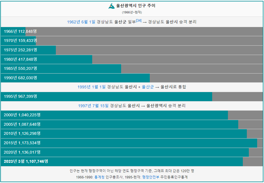 울산시 인구는 1966년 11만명 이었습니다. 그리고 2000년 처음으로 100만명을 돌파했고 2015년 가장 많은 인구인 117만이 거주하였습니다. 2023년 현재 110만명이 울산시에 거주하고 있습니다.