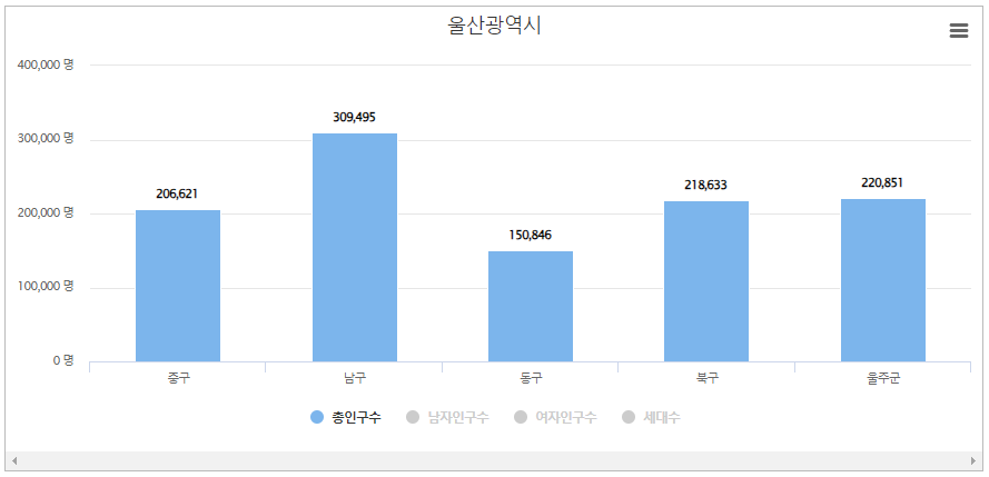 울산시에서 남구 인구가 가장 많으며 인구는 309,495명, 세대수는 140,041입니다. 두번째로는 울주군 인구가 많고 인구 220,851명, 세대수는 100,545입니다. 세번째는 북구로 인구는 218,633, 세대수는 87,962입니다.