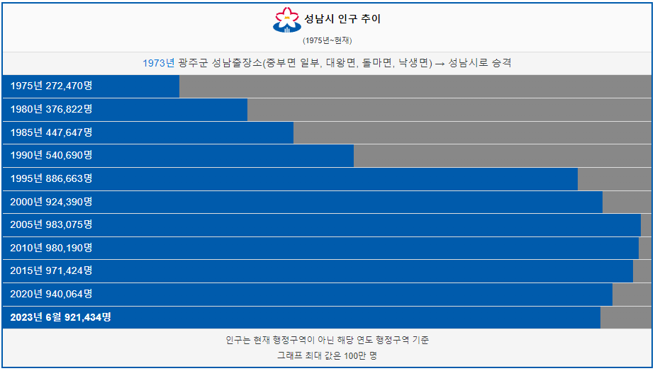 성남시 인구는 1975년 27만명 이었습니다. 그리고 2000년 처음으로 90만명을 돌파했고 2005년 가장 많은 인구인 98만이 거주하였습니다. 2023년 현재 92만명이 성남시에 거주하고 있습니다.