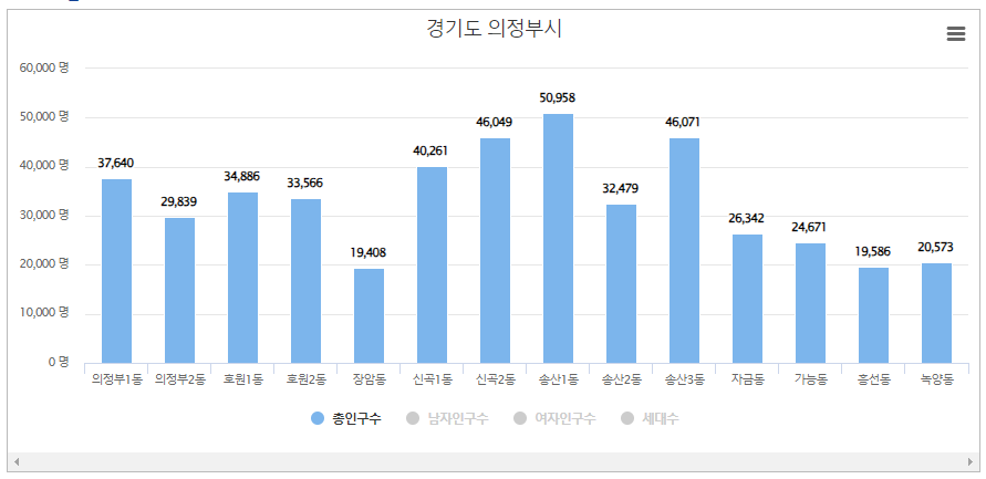 의정부시에서 송산1동 인구가 가장 많으며 인구는 50,958명, 세대수는 21,990입니다. 두번째로는 송산3동 인구가 많고 인구 46,071명, 세대수는 18,084입니다. 세번째는 신곡2동으로 인구는 46,049, 세대수는 19,083입니다.