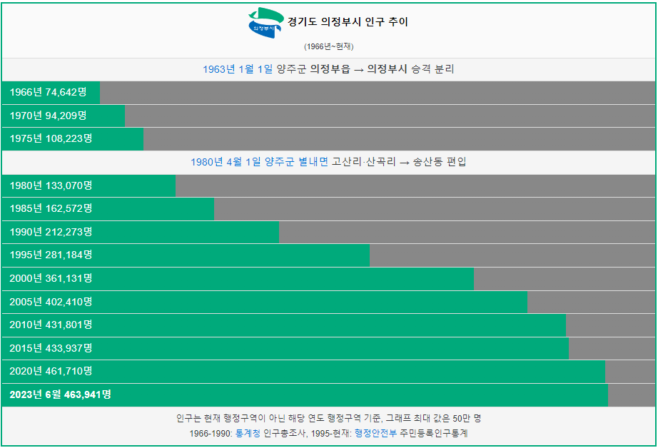 의정부시 인구는 1966년 7만명 이었습니다. 그리고 2005년 처음으로 40만명을 돌파했고 이후 감소없이 인구가 꾸준히 증가하였습니다. 2023년 현재 46만명이 의정부시에 거주하고 있습니다.