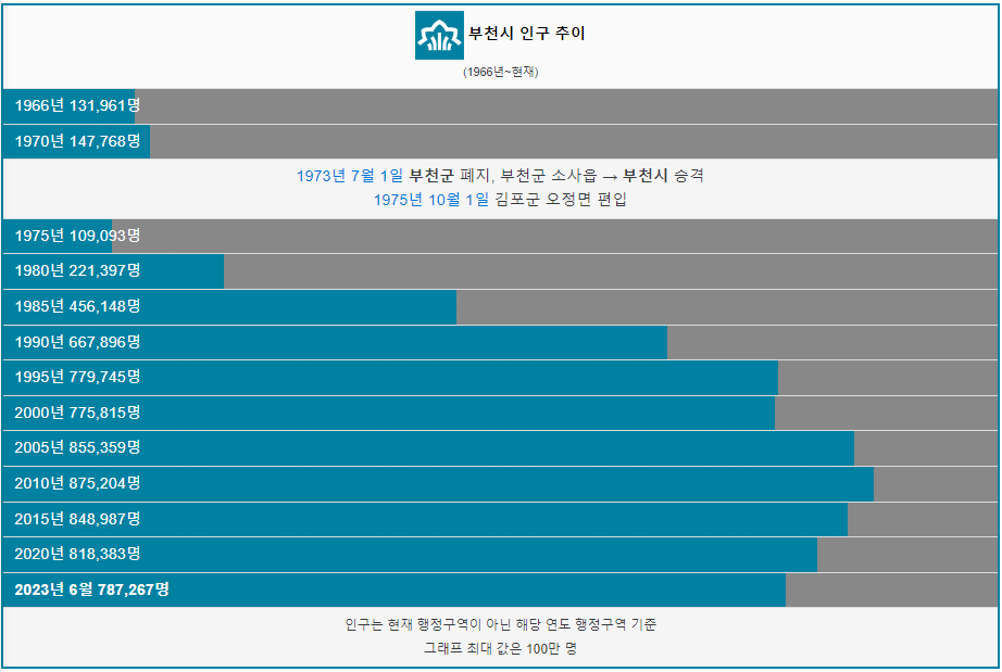 부천시 인구는 1966년 13만명 이었습니다. 그리고 1990년 처음으로 50만명을 돌파했고 2010년 가장 많은 인구인 87만이 거주하였습니다. 2023년 현재 78만명이 부천시에 거주하고 있습니다.