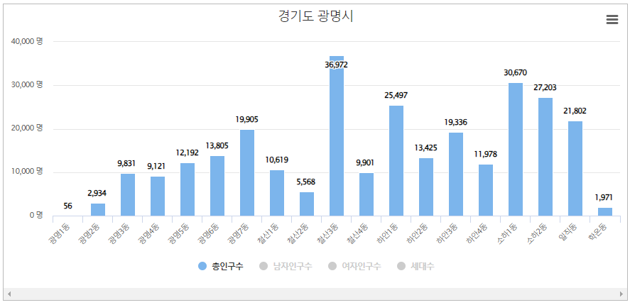 광명시에서 철산3동 인구가 가장 많으며 인구는 36,972명, 세대수는 12,802입니다. 두번째로는 소하1동 인구가 많고 인구 30,670명, 세대수는 11,547입니다. 세번째는 소하2동로 인구는 27,203, 세대수는 11,174입니다.