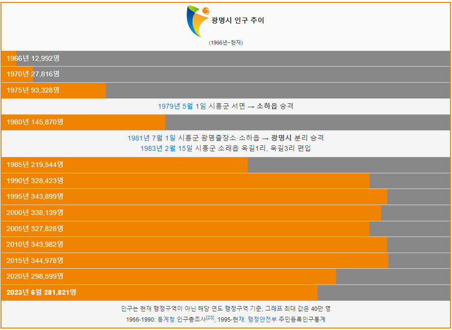 광명시 인구는 1966년 1만명 이었습니다. 그리고 1990년 처음으로 30만명을 돌파했고 2015년 가장 많은 인구인 34만이 거주하였습니다. 2023년 현재 28만명이 광명시에 거주하고 있습니다.