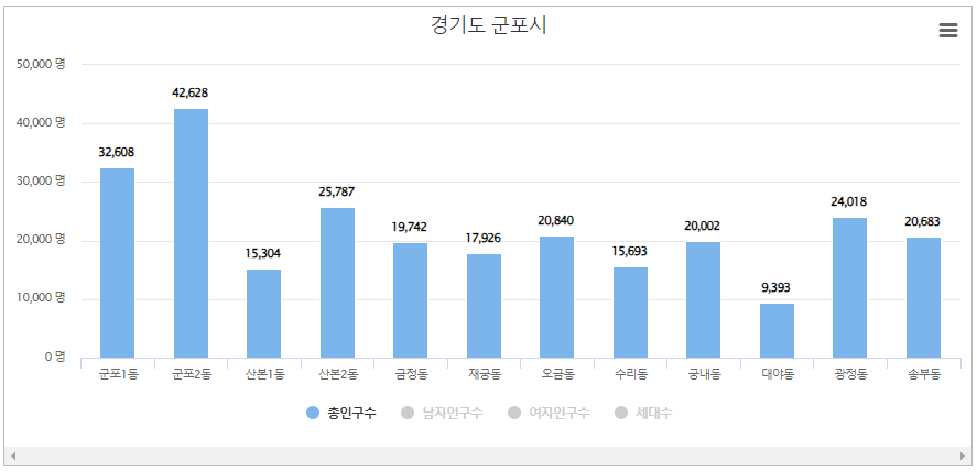 군포시에서 군포2동 인구가 가장 많으며 인구는 42,628명, 세대수는 16,325입니다. 두번째로는 군포1동 인구가 많고 인구 32,608명, 세대수는 15,591입니다. 세번째는 산본2동으로 인구는 25,787, 세대수는 9,874입니다.