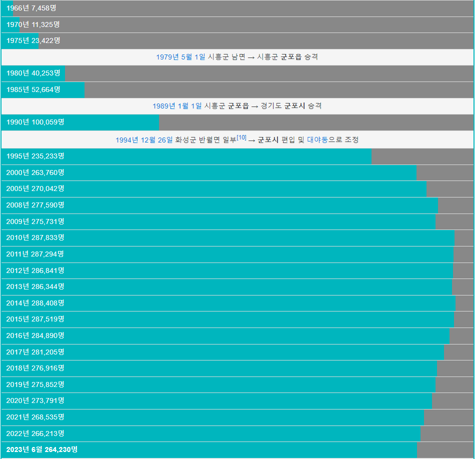 군포시 인구는 1966년 7천명 이었습니다. 그리고 1990년 처음으로 10만명을 돌파했고 2014년 28만명으로 가장 많은 인구가 군포시에 거주하였습니다. 2023년 현재 26만명이 군포시에 거주하고 있습니다.