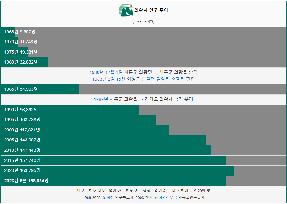 의왕시 인구는 1966년 9천명 이었습니다. 그리고 1995년 처음으로 10만명을 돌파했고 2020년 16만명으로 가장 많은 인구가 거주하였습니다. 2023년 현재 15만명이 의왕시에 거주하고 있습니다.