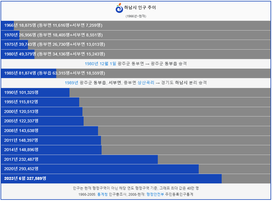 하남시 인구는 1966년 1만명 이었습니다. 그리고 1990년 처음으로 10만명을 돌파했고 이후 감소없이 인구가 꾸준히 증가하였습니다. 2023년 현재 32만명이 하남시에 거주하고 있습니다.