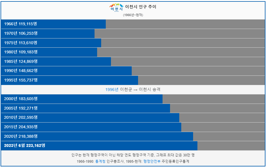 이천시 인구는 1966년 11만명 이었습니다. 그리고 2010년 처음으로 20만명을 돌파했고 이후 감소없이 인구가 꾸준히 증가하였습니다. 2023년 현재 22만명이 이천시에 거주하고 있습니다.