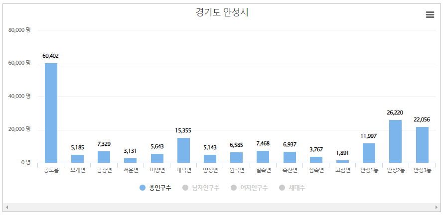 안성시에서 공도읍 인구가 가장 많으며 인구는 60,402명, 세대수는 26,310입니다. 두번째로는 안성2동 인구가 많고 인구 26,220명, 세대수는 12,369입니다. 세번째는 안성3동로 인구는 22,056, 세대수는 9,365입니다.