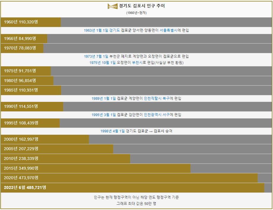 김포시 인구는 1966년 11만명 이었습니다. 그리고 2005년 처음으로 20만명을 돌파했고 이후 감소없이 인구가 꾸준히 증가하였습니다. 2023년 현재 48만명이 김포시에 거주하고 있습니다.