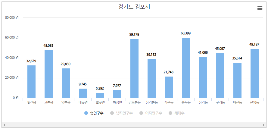 김포시에서 풍무동 인구가 가장 많으며 인구는 60,399명, 세대수는 23,437입니다. 두번째로는 김포본동 인구가 많고 인구 59,178명, 세대수는 22,560입니다. 세번째는 운양동으로 인구는 49,187, 세대수는 18,580입니다.