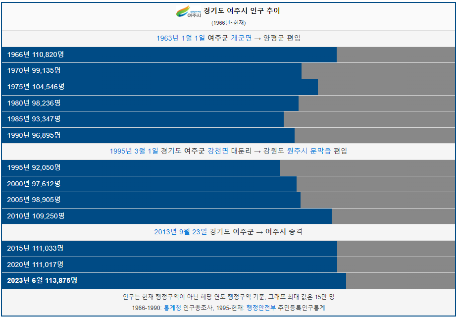 여주시 인구는 1966년 11만명 이었습니다. 이후 약 50년간 크게 인구가 증가하거나 감소하지 않고 계속 비슷한 인구를 유지하고 있습니다. 2023년 현재 11만명이 여주시에 거주하고 있습니다.