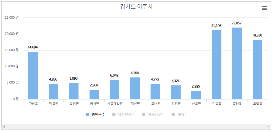 여주시에서 중앙동 인구가 가장 많으며 인구는 22,052명, 세대수는 9,550입니다. 두번째로는 여흥동 인구가 많고 인구 21,196명, 세대수는 10,352입니다. 세번째는 오학동으로 인구는 18,350, 세대수는 7,993입니다.