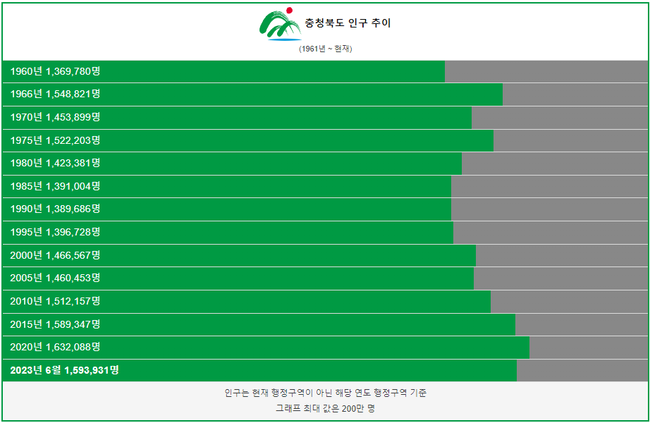 충청북도 인구는 1960년 136만명 이었습니다. 이후 인구가 크게 증가하거나 감소하지 않았습니다. 2023년 현재 159만명이 충청북도에 거주하고 있습니다.