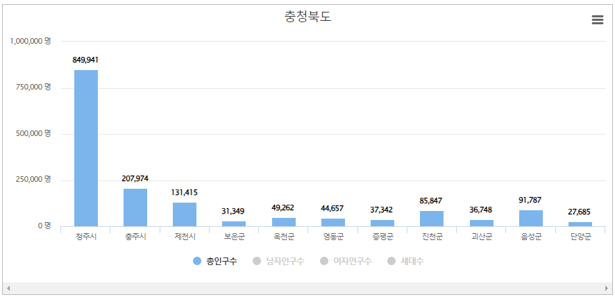 충청북도에서 청주시 인구가 가장 많으며 인구는 849,941명, 세대수는 396,053입니다. 두번째로는 충주시 인구가 많고 인구 207,974명, 세대수는 101,618입니다. 세번째는 제천시으로 인구는 131,415, 세대수는 66,608입니다.