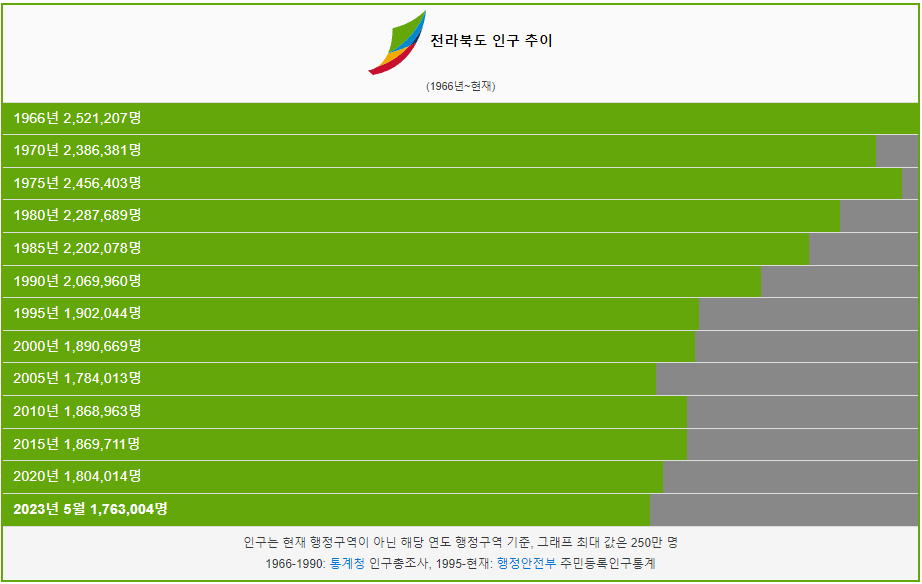 전라북도 인구는 1966년 252만명 이었습니다. 이후 지속적으로 인구가 감소하여 1995년 190만명으로 처음으로 200만명 이하로 감소하였습니다. 2023년 현재 176만명이 전라북도에 거주하고 있습니다.