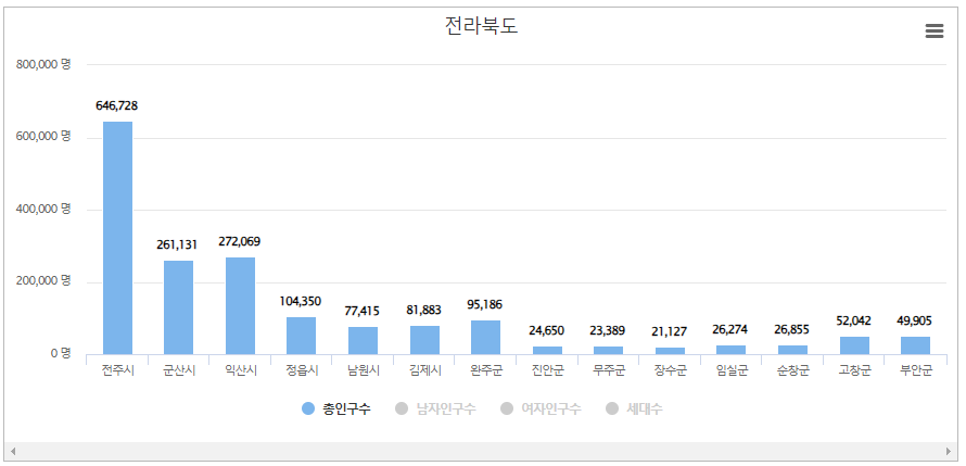 전라북도에서 전주시 인구가 가장 많으며 인구는 646,728명, 세대수는 296,637입니다. 두번째로는 익산시 인구가 많고 인구 272,069명, 세대수는 130,467입니다. 세번째는 군산시으로 인구는 261,131, 세대수는 123,615입니다.