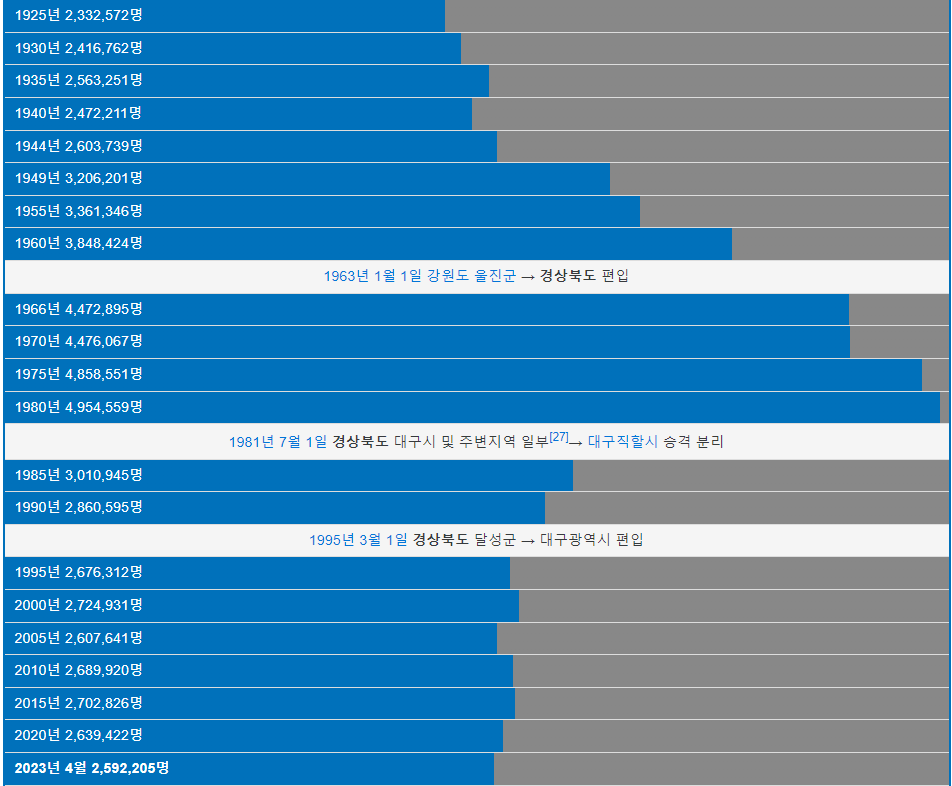 경상북도 인구는 1925년 233만명 이었습니다. 이후 인구가 꾸준히 증가하여 1980년 495만명이 거주하였습니다. 하지만 1981년 대구시와 주변 일부지역이 대구직할시로 승격 분할되면서 다시 인구가 301만명으로 감소하였습니다. 2023년 현재 259만명이 경상북도에 거주하고 있습니다.
