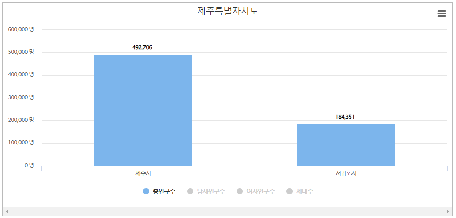 제주도에서 제주시 인구가 가장 많으며 인구는 492,706명, 세대수는 223,851입니다. 두번째로는 서귀포시 인구가 많고 인구 184,351명, 세대수는 89,018입니다.