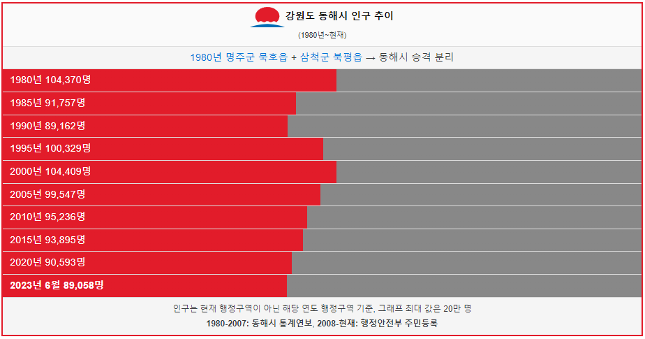 동해시 인구는 1980년 10만명 이었습니다. 그 이후 현재까지 인구가 크게 증가하거나 감소하지 않고 있습니다. 2023년 현재 8만 9천명이 동해시에 거주하고 있습니다.