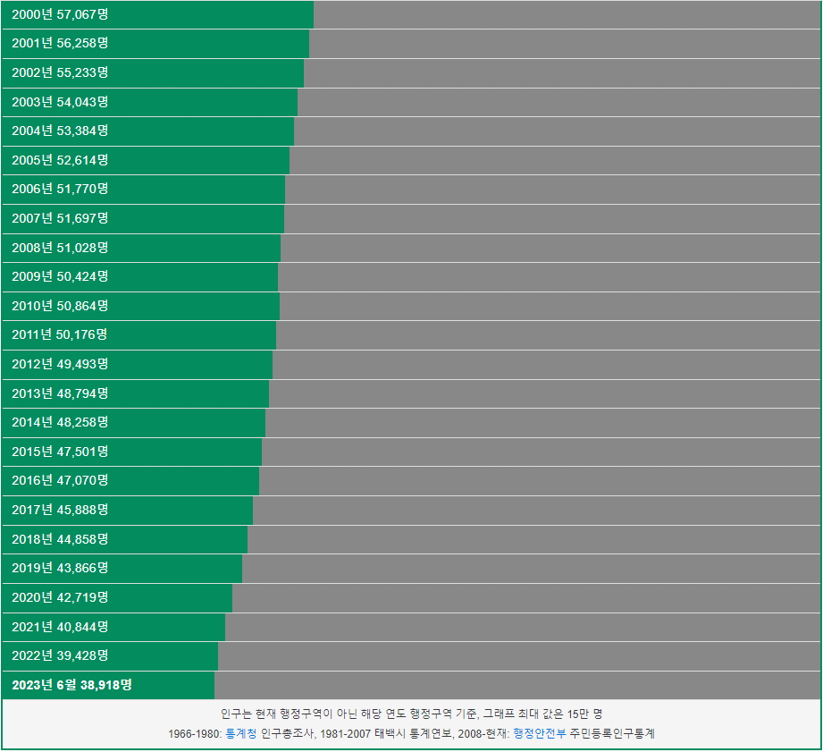 태백시 인구는 2000년 5만명 이었습니다. 그리고 2012년 처음으로 5만명 이하로 감소하였고 지속적으로 인구가 감소하고 있습니다. 2023년 현재 3만명이 태백시에 거주하고 있습니다.