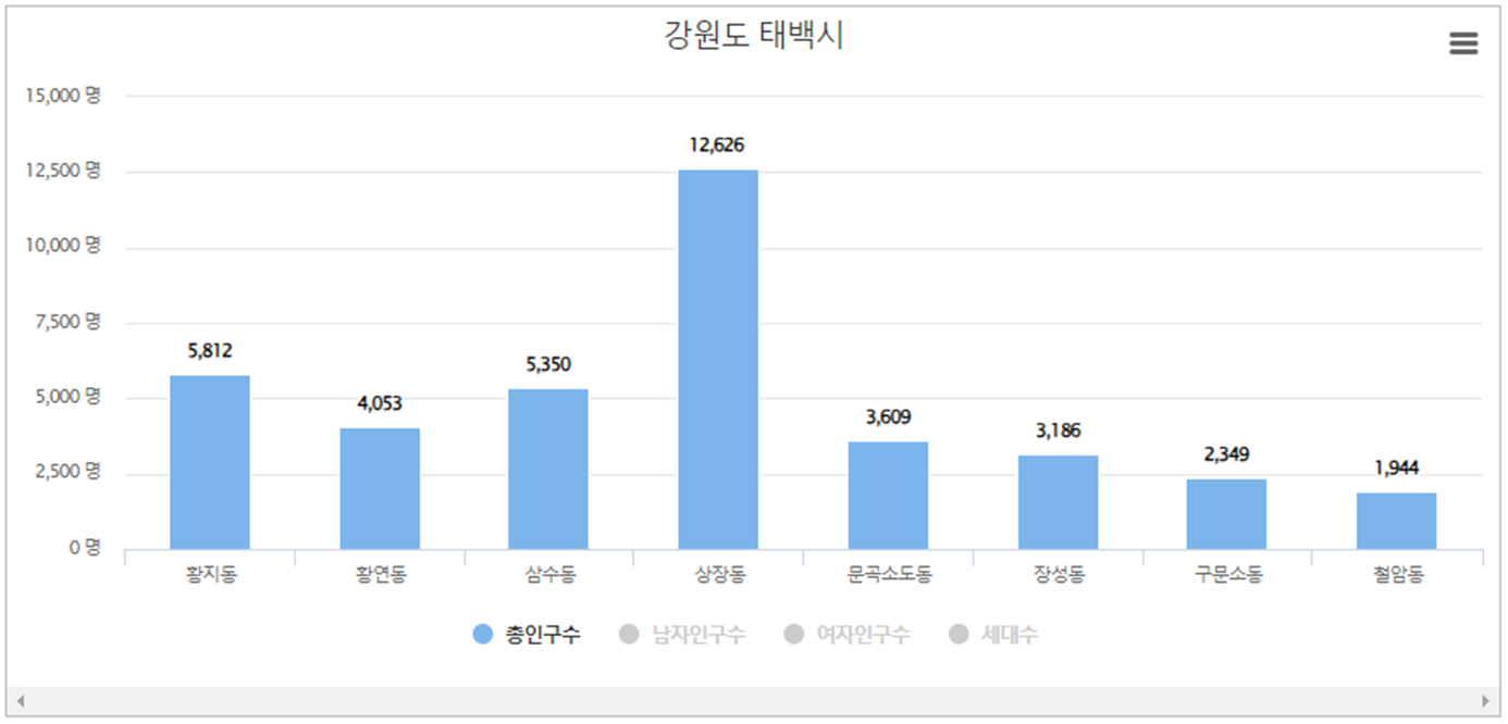 태백시에서 상장동 인구가 가장 많으며 인구는 12,626명, 세대수는 5,984입니다. 두번째로는 황지동 인구가 많고 인구 5,812명, 세대수는 2,842입니다. 세번째는 삼수동으로 인구는 5,350, 세대수는 2,744입니다.