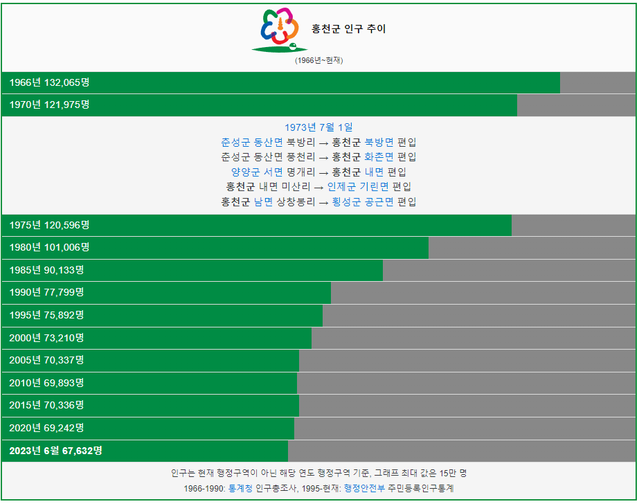 홍천군 인구는 1966년 13만명 이었습니다. 이후 인구가 지속적으로 감소하였고 2000년 이후에는 큰 변동없이 7만명 정도를 유지하고 있습니다. 2023년 현재 7만명이 홍천군에 거주하고 있습니다.