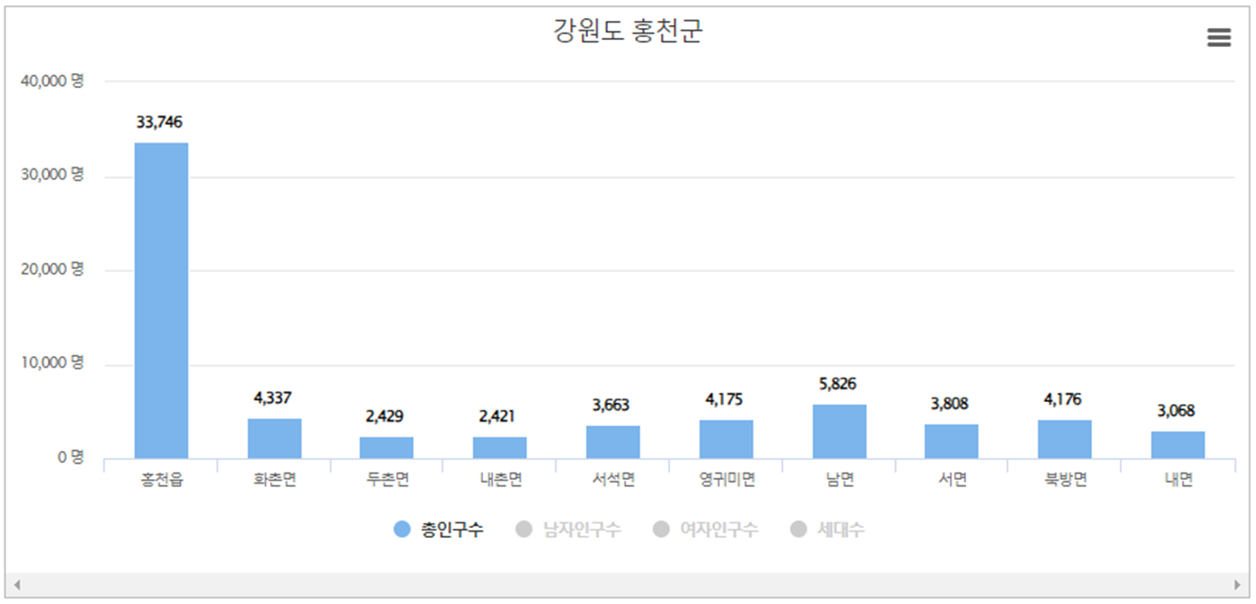 홍천군에서 홍천읍 인구가 가장 많으며 인구는 33,746명, 세대수는 15,725입니다. 두번째로는 남면 인구가 많고 인구 5,826명, 세대수는 3,235입니다. 세번째는 화촌면으로 인구는 4,337, 세대수는 2,500입니다.