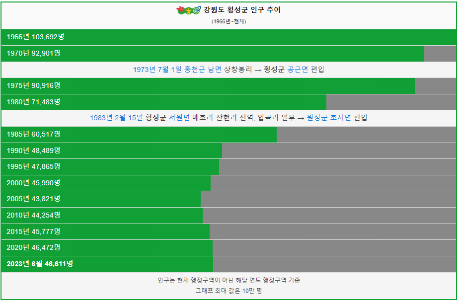 횡성군 인구는 1966년 10만명 이었습니다. 그리고 1990년 처음으로 5만명 이하로 인구가 감소하였습니다. 2023년 현재 4만명이 횡성군에 거주하고 있습니다.