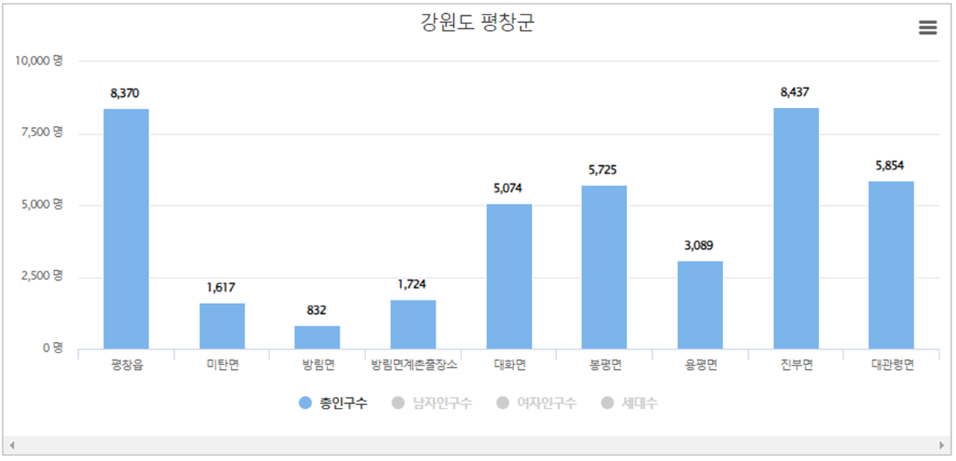 평창군에서 진부면 인구가 가장 많으며 인구는 8,437명, 세대수는 4,281입니다. 두번째로는 평창읍 인구가 많고 인구 8,370명, 세대수는 4,269입니다. 세번째는 대관령면으로 인구는 5,854, 세대수는 3,439입니다.