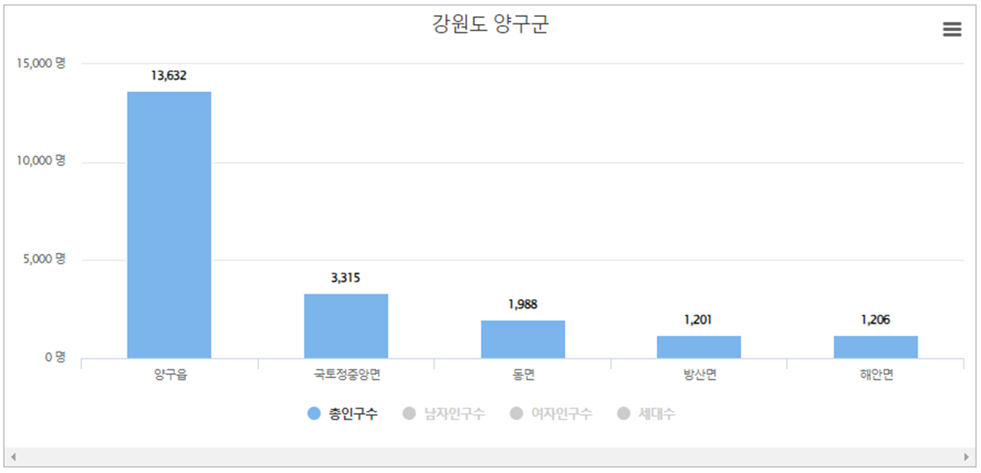 양구군에서 양구읍 인구가 가장 많으며 인구는 13,632명, 세대수는 6,223입니다. 두번째로는 국토정중앙면 인구가 많고 인구 3,315명, 세대수는 1,898입니다. 세번째는 동면으로 인구는 1,988, 세대수는 1,125입니다.