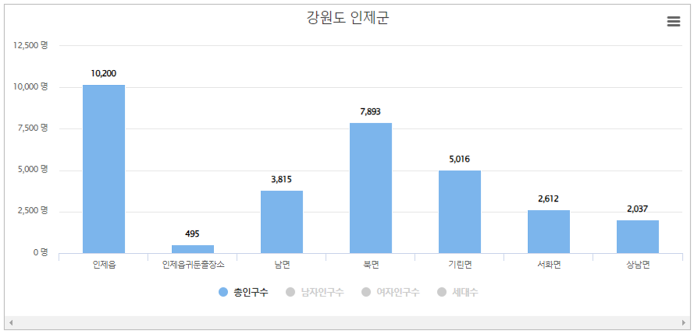 인제군에서 인제읍 인구가 가장 많으며 인구는 10,200명, 세대수는 4,763입니다. 두번째로는 북면 인구가 많고 인구 7,893명, 세대수는 4,117입니다. 세번째는 기린면으로 인구는 5,016, 세대수는 2,732입니다.