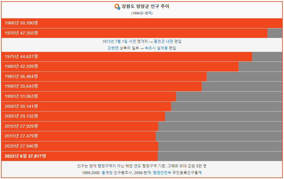 양양군 인구는 1966년 5만명 이었습니다. 이후 인구가 꾸준히 감소하였고 2005년 처음으로 3만명 이하의 인구가 거주하였습니다. 2023년 현재 2만명이 양양군에 거주하고 있습니다.