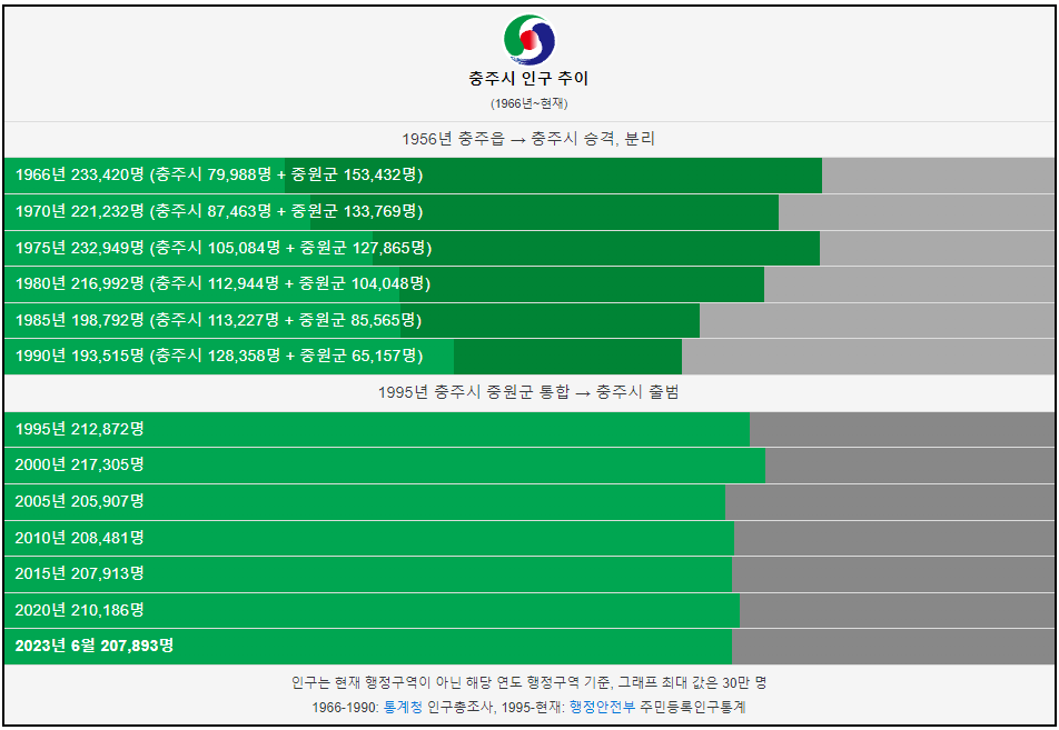 충주시 인구는 1966년 23만명 이었습니다. 이후 인구가 크게 증가하거나 감소하지 않고 비슷한 수준을 현재까지 유지하고 있습니다. 2023년 현재 20만명이 충주시에 거주하고 있습니다.