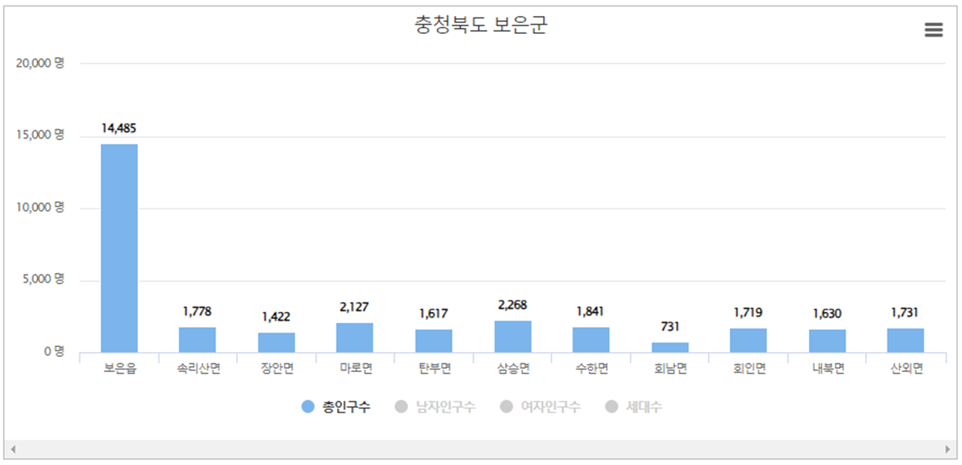 보은군에서 보은읍 인구가 가장 많으며 인구는 14,485명, 세대수는 7,117입니다. 두번째로는 삼승면 인구가 많고 인구 2,268명, 세대수는 1,308입니다. 세번째는 마로면로 인구는 2,127, 세대수는 1,229입니다.
