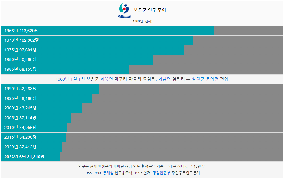 보은군 인구는 1966년 11만명 이었습니다. 이후 증가 없이 지속적으로 인구가 감소하였습니다. 2023년 현재 3만명이 보은군에 거주하고 있습니다.