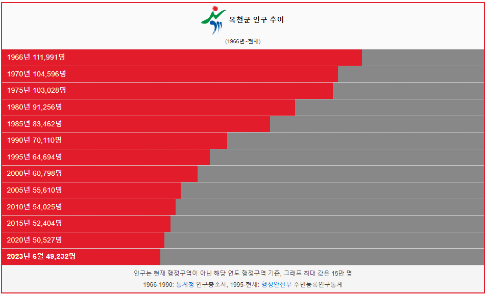옥천군 인구는 1966년 9천명 이었습니다. 그리고 1995년 처음으로 10만명을 돌파했고 2020년 16만명으로 가장 많은 인구가 거주하였습니다. 2023년 현재 15만명이 옥천군에 거주하고 있습니다.