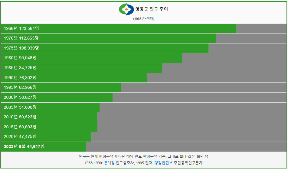영동군 인구는 1966년 12만명 이었습니다. 그리고 1980년 인구가 처음으로 10만명 이하로 감소하였고 이후에도 지속적으로 인구가 감소하였습니다. 2023년 현재 4만명이 영동군에 거주하고 있습니다.