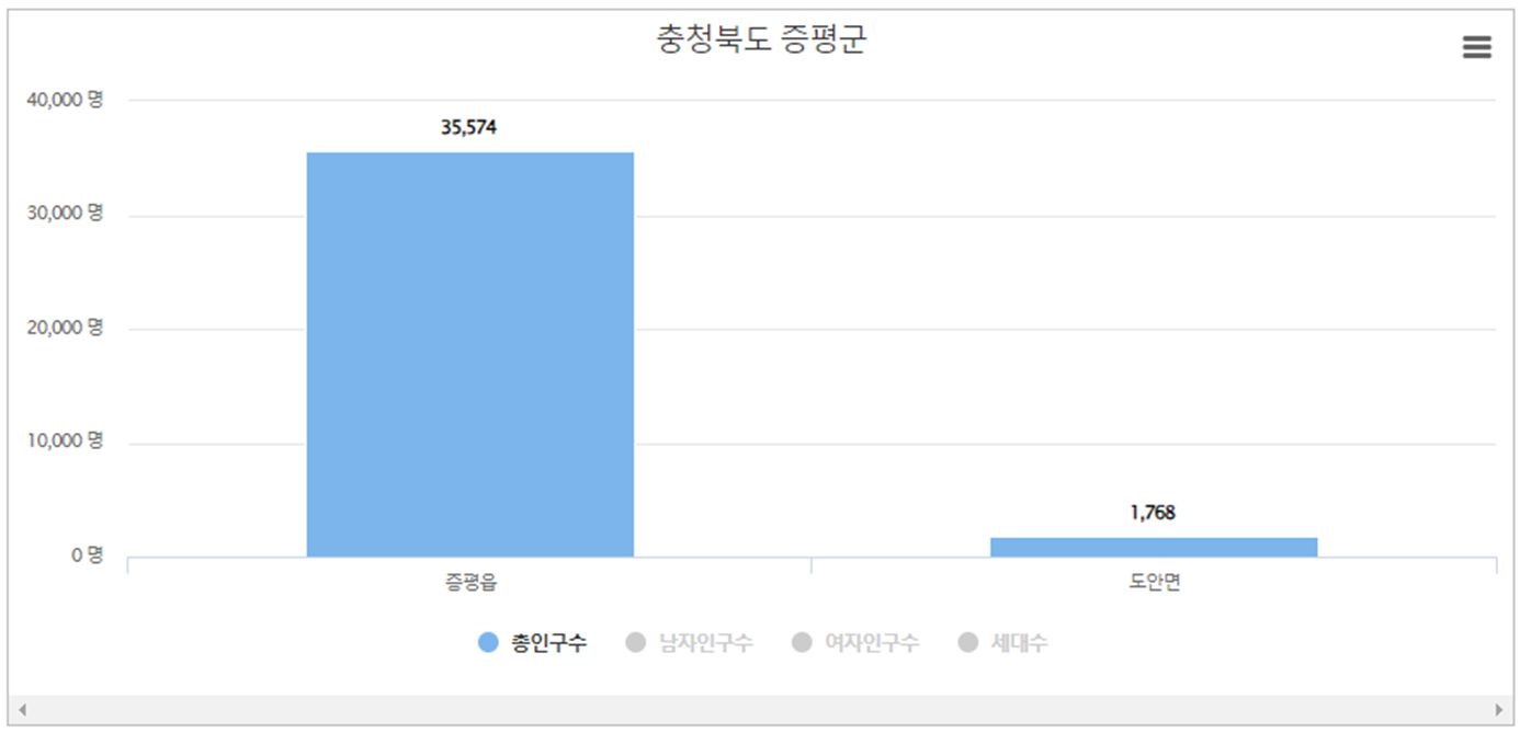 증평군에서 증평읍 인구가 가장 많으며 인구는 35,574명, 세대수는 17,768입니다. 두번째로는 도안면 인구가 많고 인구 1,768명, 세대수는 994입니다.