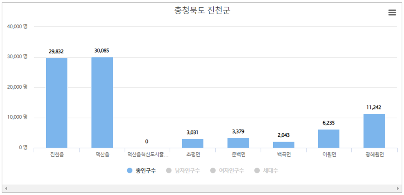 진천군에서 덕산읍 인구가 가장 많으며 인구는 30,085명, 세대수는 13,360입니다. 두번째로는 진천읍 인구가 많고 인구 29,832명, 세대수는 14,685입니다. 세번째는 광혜원면으로 인구는 11,242, 세대수는 6,048입니다.