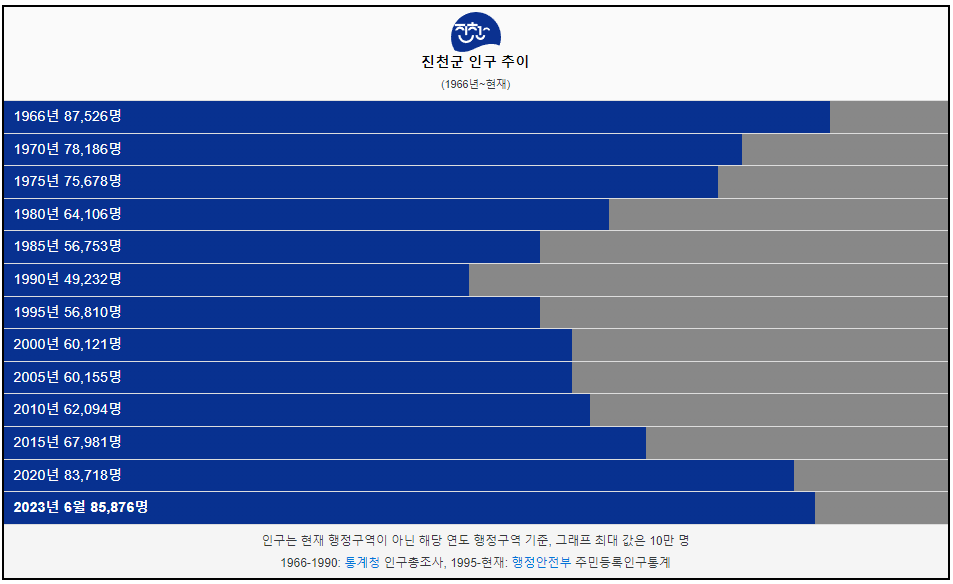 진천군 인구는 1966년 8만명 이었습니다. 그리고 1990년 까지 인구가 감소했다가 이후 다시 증가하기 시작했습니다. 2023년 현재 8만명이 진천군에 거주하고 있습니다.