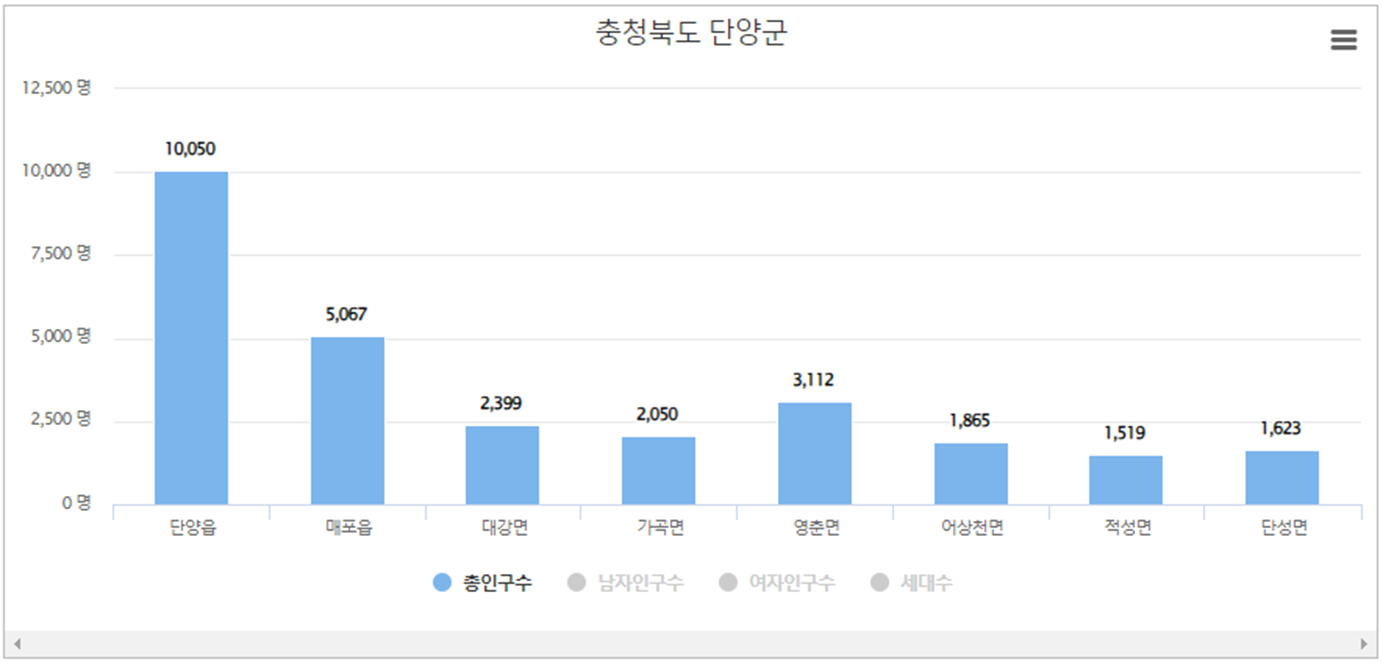 단양군에서 단양읍 인구가 가장 많으며 인구는 10,050명, 세대수는 5,014입니다. 두번째로는 매포읍 인구가 많고 인구 5,067명, 세대수는 2,635입니다. 세번째는 영춘면로 인구는 3,112, 세대수는 1,843입니다.